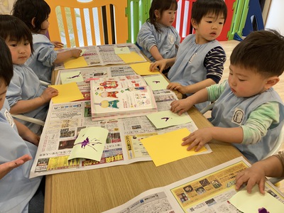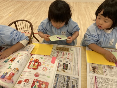 3、4歳児さんは、折り紙 お絵描き 両面テープはがし のり貼りを行いました!折り紙は先生のお手本を見ながら一生懸命折っていました✨