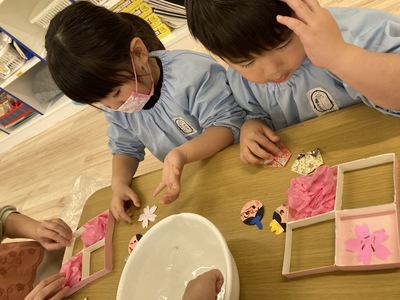 2歳児さんはおひな様とおだいり様のお顔を描いたり、画用紙に絵の具を垂らして吹き絵をしましたー!