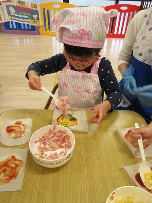 今回のクッキングは、餃子の皮にソースを塗ってベーコンやコーン、ピーマン、チーズをトッピングしていきます。