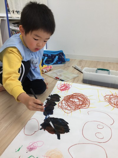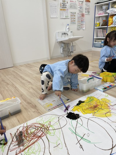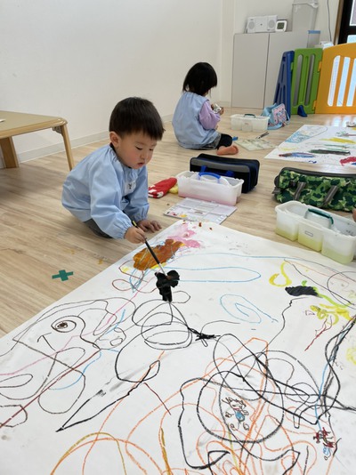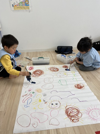 今日の絵画教室では、二人一組になって大きな1枚の紙に好きな絵を描きました。