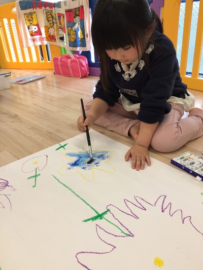 「果物の世界」や「恐竜の世界」「お花の世界」など、ちょこちょこ床に大きくはみ出しながらダイナミックに描いていました♡