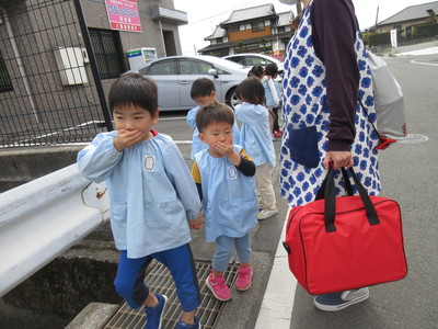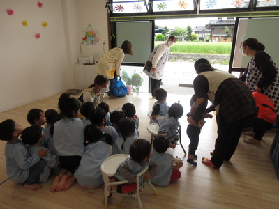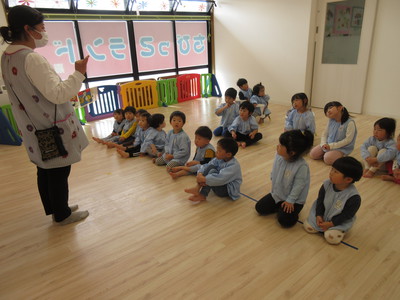 絵本を使って「お か し も」のお話をして、避難経路を説明します。