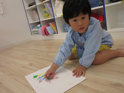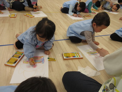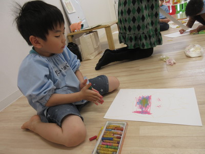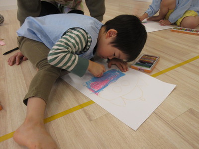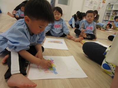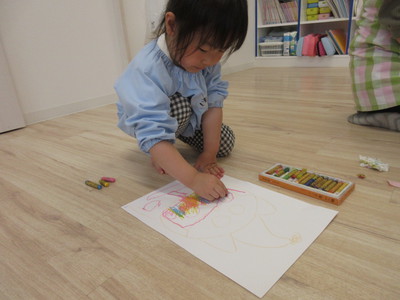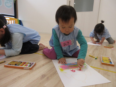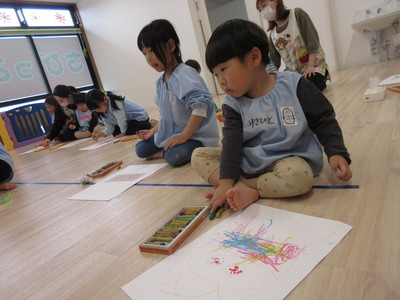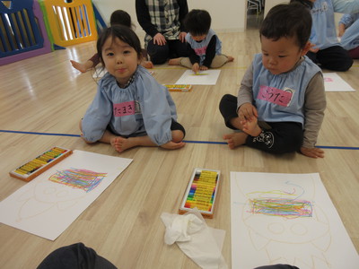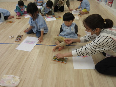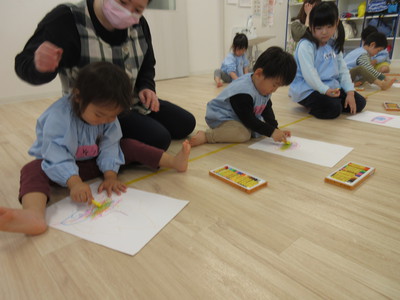 新たに2歳児さんも加わりクレヨンのいろいろな技法を学びました。